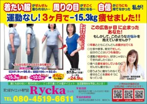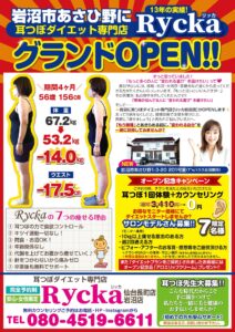 耳つぼダイエット専門店Rycka岩沼店グランドOPEN!! 公開済み: 2026年1月6日更新: 2026年1月6日作成者: rycka_adminカテゴリー: 新着情報 耳つぼダイエット専門店Ryckaが、岩沼市あさひ野にOPENします!! お得なオープン記念キャンペーンも、ご用意していますので、気になる方はお気軽にお問合せください!! 関連記事 28 私ならどれくらい痩せられるの??と思ったらまずはお電話を!! いつもご覧頂きありがとうございます。 山形・酒田で話題の耳つぼダイエット リッカです。 16歳から70歳のオール世代の女性が大幅減量に成功しています!! 健康痩せ3ヶ月チャレンジ、-8kg以上目指します!! […] 公開済み: 2016年11月28日更新: 2019年2月4日作成者: rycka_adminカテゴリー: 新着情報 27 Rycka*リッカのホームページが完成しました!! メイキングスリム Rycka*リッカのホームページが完成しました!! 随時更新していきますので、ぜひみなさんご覧になってください。 公開済み: 2013年5月27日更新: 2019年2月1日作成者: rycka_adminカテゴリー: 新着情報 04 秋限定キャンペーンのご案内 いつもホームページをご覧いただいてありがとうございます。 秋限定のキャンペーンのご案内! 秋限定 耳つぼダイエット カウンセリング+施術体験受付中! 通常3,080円→半額の1,540円(税込) ご興味のある方は、ぜひお […] 公開済み: 2020年9月4日更新: 2020年9月4日作成者: rycka_adminカテゴリー: 新着情報